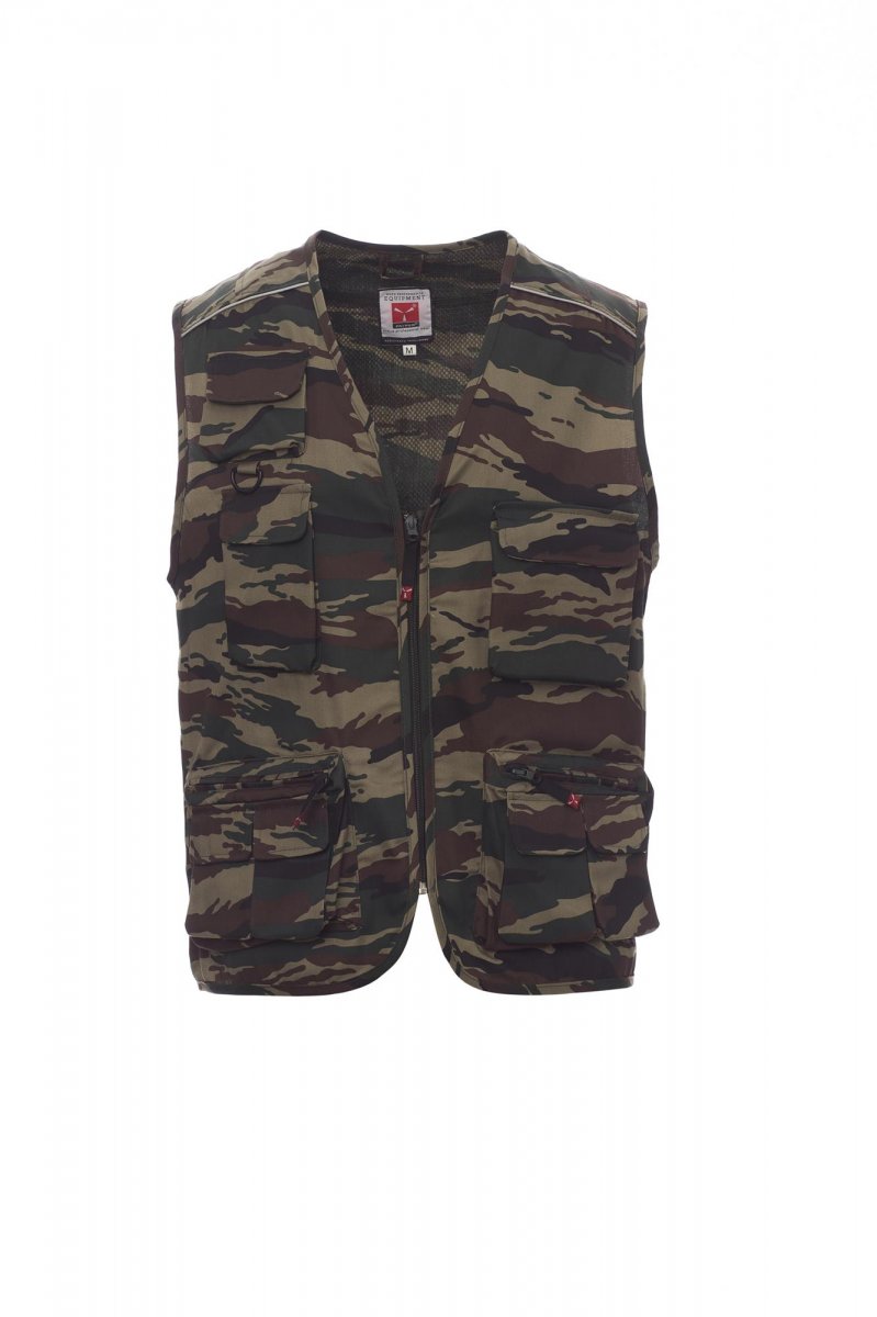 Gilet estivo, zip, composizione multitasche frontale con un portabadge reversibile, piping reflex alle spalle e schiena, ampia cacciatora posteriore, interno: fodera in dry-tech, in colore a contrasto, aperta per agevolare stampe e ricami.