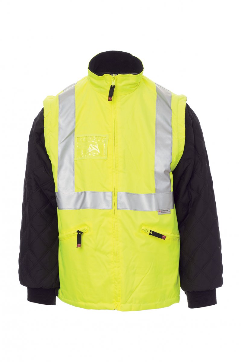 Parka quattro usi in alta visibilità con bande 3M, composto da: giacca esterna non imbottita, zip in plastica con cursore in metallo coperta da patta e bottoni, cappuccio sagomato e coulisse richiudibile nel colletto, polsini regolabili elasticizzati, due ampie tasche frontali con cerniera e patta, portacellulare, cuciture termonastrate. Giubbino interno maniche staccabili, imbottito, zip in plastica con cursore in metallo, polsino elasticizzato, due tasche frontali con zip, porta badge, colletto in micropile, zip interna.