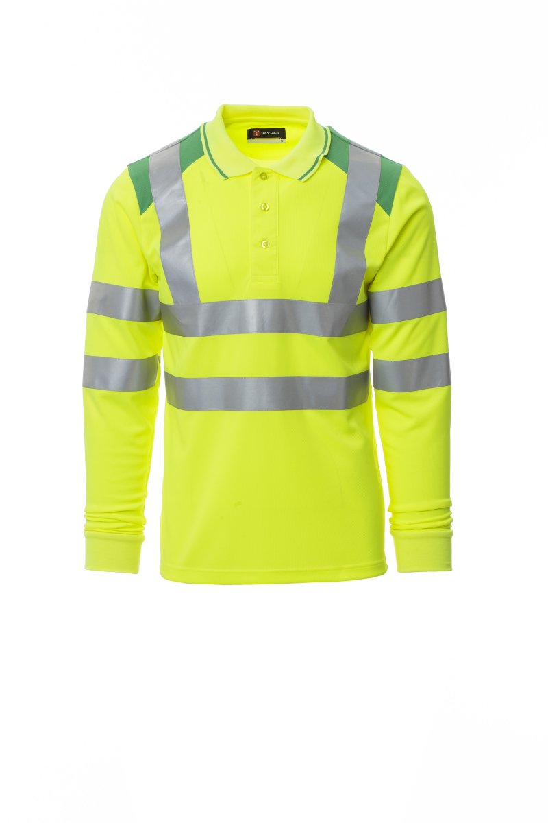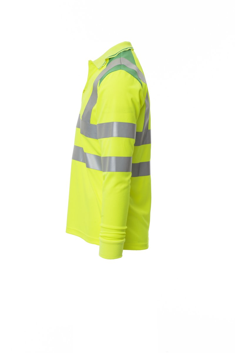Polo bicolore da uomo a manica lunga in alta visibilità con bande riflettenti, con 3 bottoni in tinta effetto perlato, collo e bordo manica con fine profilo a contrasto, colletto e bordo manica a costine, spacchetti laterali, cuciture del collo coperte.