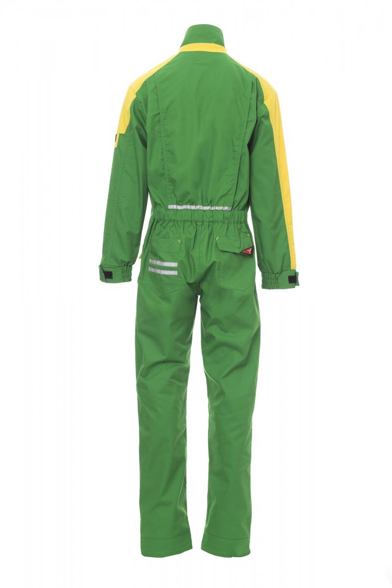 Tuta bicolore da lavoro, chiusura frontale con zip, colletto, polsini con elastico e stringi polsi con bottone, due tasche frontali LOCK SYSTEM rinforzate sul fondo, una ampia tasca al petto multifunzione, porta smart phone e porta badge a scomparsa, due tasche retro di cui una con patta di chiusura e una con due bande riflettenti, piping reflettente al petto e sul fondo schiena, elastico sul fondo schiena e doppio soffietto sulla schiena per un miglior confort nei movimenti.